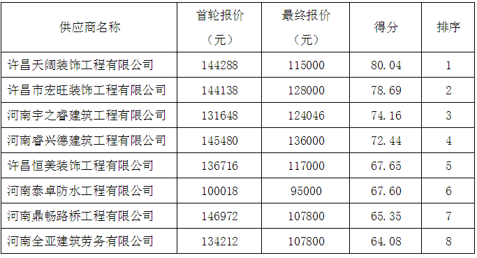 2、采购人确认成交供应商:许昌天阔装饰工程有限公司,成交金额:115000元,地址:许昌市魏都区文峰路鑫悦广场5号楼。