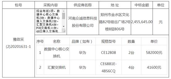 货物详情包括:综合布线1项,数据中心核心交换机2台,数据中心接入交换机2台,汇聚交换机4台,POE交换机11台,48口接入交换机20台,全光口接入交换机1台,放装AP135台,高密AP5台,一体化机柜1台,具体内容详见招标文件。