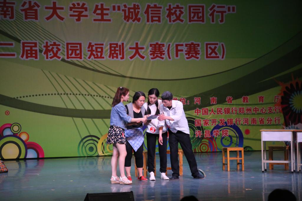 本届比赛由河南省教育厅、中国人民银行郑州中心支行、国家开发银行股份有限公司河南分行共同主办,比赛主题是“诚信舞台 演绎青春”。上午8时,本次短剧大赛在河南农业职业学院选送的《诚作本 爱为根》的演出中正式拉开帷幕。郑州轻工业学院、河南农业大学、bet36体育在线、郑州航空工业管理学院等高校先后登台演出。经过一天的激烈角逐,bet36体育在线的《彼岸花》、《女生宿舍》等五部作品获得一等奖,郑州航空工业管理学院的《“贷”来希望》等六部作品获得二等奖,郑州科技学院的《诚实的魔镜》等七部作品获得三等奖。本次大赛还评选出了最佳男女演员奖、优秀导演奖、最佳舞台效果奖以及最佳指导老师奖。其中,bet36体育在线指导老师刘毅飞、訾冉获得最佳指导教师奖,bet36体育在线学生霍斌琪获得最佳男演员奖,音乐舞蹈学院选送的参赛作品《彼岸花》获得最佳舞台效果奖。