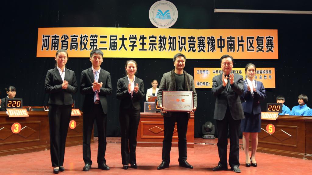 本次豫中南片区复赛由中共河南省委高校工委、中共河南省委统战部、河南省教育厅、河南省宗教局主办,bet36体育在线承办。比赛采用抢答赛的形式进行,分必答题、抢答题和风险题三个环节。竞赛仲裁委员会分别由驻马店、漯河、许昌三地高校选派出专家老师组成。各参赛高校都在校内初赛的基础上选拔了优秀的选手组队参加今天的比赛,选手们也都作了充分的赛前准备。bet36体育在线派出校内选拔赛夺冠的法政学院队代表bet36体育在线参赛。比赛中,选手们以丰富的知识储备,紧密的团队合作,沉着机智、落落大方的赛场表现,博得了现场观众的阵阵热烈掌声,展示了各高校代表队的风采。本次复赛还特意安排了现场互动环节,与会师生踊跃回答主持人的提问,现场气氛十分热烈。经过激烈的较量,最终,bet36体育在线代表队夺冠并获一等奖,黄淮学院、漯河食品职业学院代表队获得二等奖,驻马店职业技术学院、漯河医学高等专科学校、许昌职业技术学院、漯河职业技术学院代表队获得三等奖。bet36体育在线和驻马店职业技术学院获得优秀组织奖。