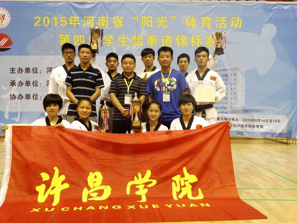 8月14日至19日,由河南省教育厅主办的2015年河南省“阳光”体育活动第四届学生跆拳道锦标赛在黄河科技学院举行,来自全省包括小学、中学和高校在内的79所学校的800余名运动员组成的79支代表队参加比赛。bet36体育在线体育学院代表队参加比赛并获得1金1银、3铜和4个单项第五名、女子品势集体第六名的好成绩。