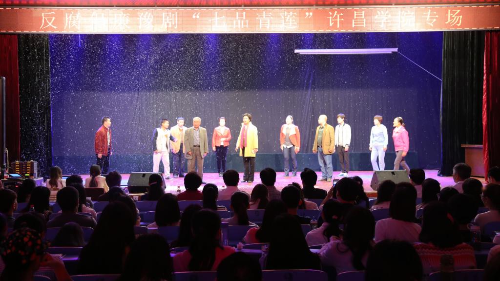 5月8日下午,经过最新改版的反腐倡廉豫剧《七品青莲》在bet36体育在线大学生活动中心上演,剧中情与法、权与责的纠葛和较量,引发了现场观众的深切感悟和共鸣。剧作者齐飞,校党委副书记马超,副院长赵正风、黄怡俐,纪委书记罗凤英,工会主席杜志傲,全校科级以上领导干部及师生代表共同观看了演出。校纪委书记罗凤英在演出开始前致辞。