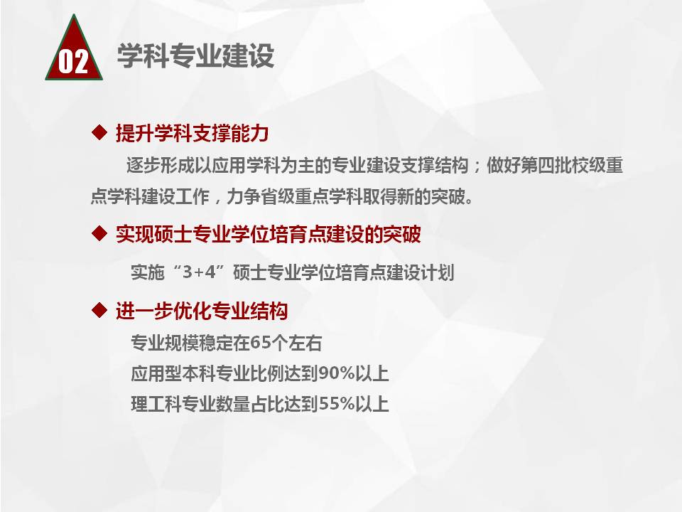 总规划明确提出今后五年的发展战略是“坚持四个统一、完善四项基本建设、实现四个突破、形成四大特色”,基本完成“三基一体”的建设任务,即五年内把学校建设成为高层次应用型人才培养基地、政产学研协同创新基地、先进技术转移与服务基地和高等教育、职业教育、继续教育有机联合体。实现发展战略的载体是“河南省示范性应用技术类型本科院校”建设和国家级“十三五”“产教融合发展工程应用型本科院校”建设。五年内事业发展的战略目标是初步建成以培养高层次应用型人才为核心,与区域重点产业、主导产业、特色产业和区域文化高度融合,特色鲜明的高水平应用技术大学。