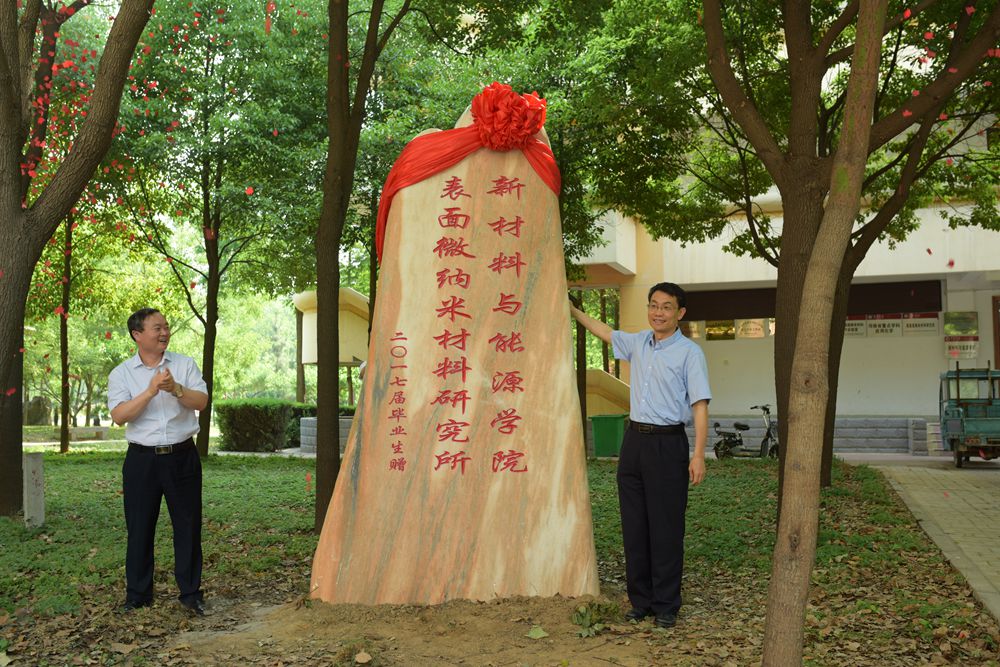 仪式上,校党委副书记孙海向捐赠纪念石的毕业生表示感谢,并充分肯定了新材料与能源学院2017届毕业生们出于对母校的无限眷恋和诚挚祝福而自发组织纪念石捐赠活动的积极意义。孙海副书记说,学生们满怀感恩地成长、满怀感恩地自我完善就是对母校最大的褒奖,这块深深地饱含着毕业生对母校、对老师“拳拳之心,眷眷之情”的纪念石是学校转型发展人才培养成果的印证。孙海副书记指出,新材料与能源学院充分发挥科研反哺教学的优势,积极探索多维度人才培育新模式,收到了良好的效果。他希望毕业生们牢记 “崇德砺志、博学敬业”的校训,踏踏实实做人、认认真真做事,续写许院学子的光荣。