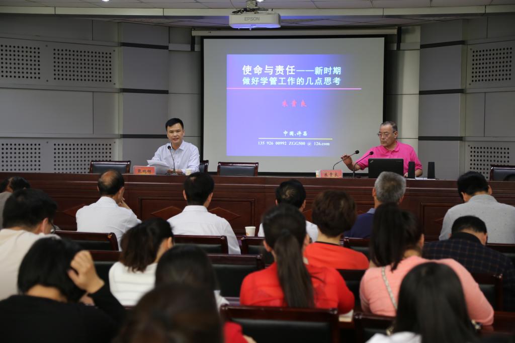 报告会前,学校关心下一代工作委员会副主任汪庆华教授向朱贵良教授颁发了bet36体育在线大学生德育宣讲团团员聘书。报告会上,朱贵良教授从目前大学校园存在一些现实问题入手,提出学生管理工作的四步曲——认识学生、了解学生、发现问题、解决问题,并指出在学生管理工作方面要特别注意两个重要节点(大一至大二的前三个学期节点和大二的第二学期之后到毕业之前节点)和三项教育(大学是什么教育、摆脱高中阶段应试阴影教育和理想信念教育)。针对新时期的学生工作管理者,朱贵良教授提出了四点新的思考:一是互联网环境下学生管理工作面临新课题;二是怎样处理邪教组织传播的问题;三是面对目前互联网上的色情泛滥,学生管理工作如何开展;四是通过转专业机制的探索解决学生稳定的深层问题。