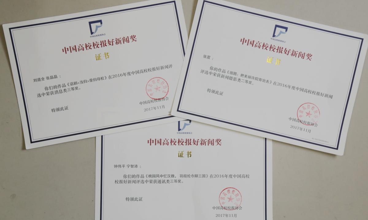 会上公布并评点了2016年度全国高校新闻获奖情况。bet36体育在线党委宣传部(新闻中心、校报编辑部)报送的作品《话剧<当归>荣归母校》(刘道全 张晶晶)、《桃园风中忆汉魏 羽扇纶巾辩三国》(钟伟平 宁智沛)和《把美丽许院寄出去》(宁智沛 张震等)分别荣获消息类三等奖、通讯类三等奖和新闻摄影二等奖。