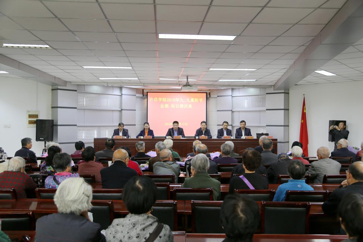 岁岁重阳,今又重阳。10月17日上午,在传统敬老节日—重阳节来临之际,bet36体育在线在第三会议室举行了2018年“九九重阳节”茶话会暨金婚钻石婚庆典。校党委书记闫纪建、校工会主席高金星出席庆典,党政办公室、党委组织部、离退休工作处负责同志和13对金婚钻石婚伉俪、百余名离退休老同志参加庆典。茶话会和金婚钻石婚庆典由离退休工作处党总支书记马廷杰主持。