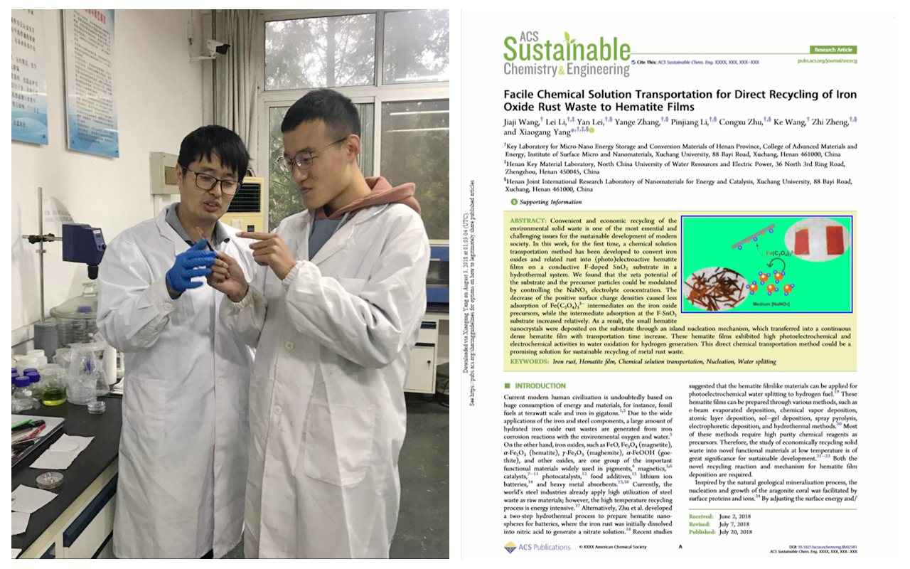 2017年9月开始,王家稷等在杨晓刚老师指导下,开始关注铁锈废弃物循环利用这一问题。他们在实验中发现利用草酸作为传输剂、以硝酸钠作为表面电荷调控剂,将铁锈通过水热法传输到FTO导电薄膜上,“变废为宝”制备得到具有(光)电活性的氧化铁薄膜,并成功应用于光电或电催化分解水制氢的阳极材料。该工作发表在ACS Sustainable Chem. Eng.期刊上,王家稷是第一作者。