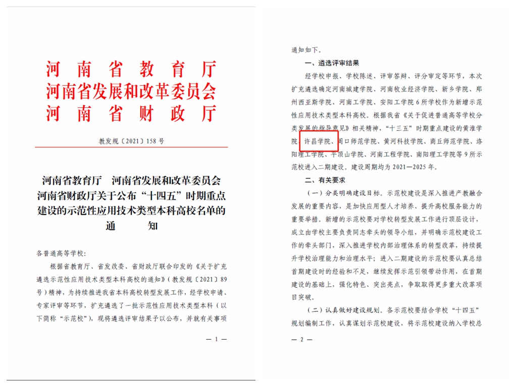 近日,河南省教育厅、河南省发展和改革委员会、河南省财政厅印发《关于公布“十四五”时期重点建设的示范性应用技术类型本科高校名单的通知》(教发规〔2021〕158号),公布遴选评审结果,bet36体育在线顺利入选河南省“十四五”时期重点建设的示范性应用技术类型本科高校,进入二期建设阶段,建设周期为2021—2025年。
