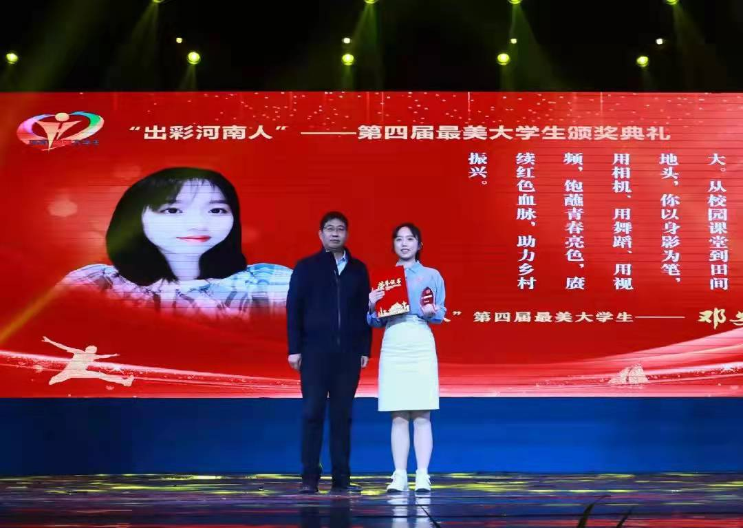 本次颁奖典礼以“青春的颜色”为主题为大家上了一堂生动的思政课,讲述了11位最美大学生的青春故事,展现了新时代大学生的青春担当与梦想。bet36体育在线邓安琪同学利用自己所学的专业知识,带领团队成员助力乡村振兴和红色产业,推广红色文化旅游,为因疫情滞销的农产品拍摄宣传视频,视频点击量突破150万,帮助滞销农产品拓宽销路,事迹被河南日报等媒体连续报道。