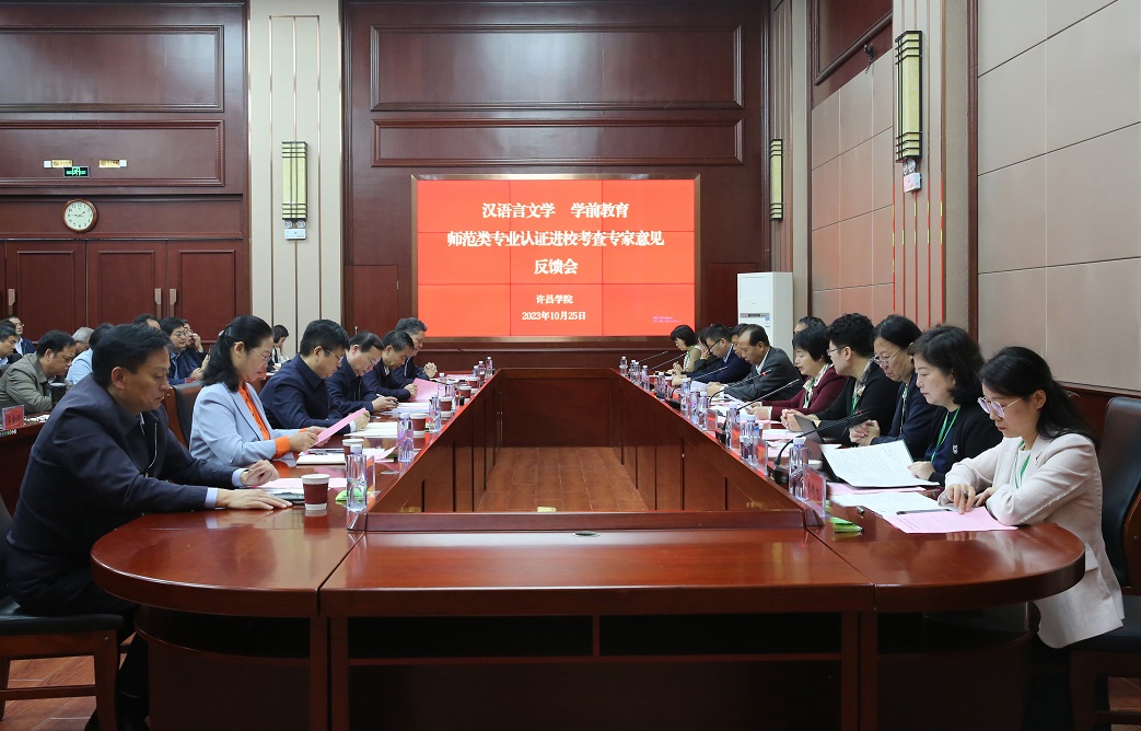 10月25日上午,bet36体育在线在学术会议中心召开汉语言文学和学前教育专业师范认证专家组反馈会。联合认证组组长兼汉语言文学专业认证组组长、华中师范大学原副校长李向农教授,学前教育专业认证组组长、华中师范大学教育学院副院长蔡迎旗等专家组全体成员,河南省教育评估中心副主任张新民,bet36体育在线全体在校校领导出席会议。反馈会由李向农教授主持。