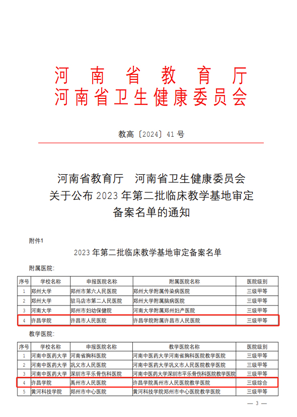 近日,河南省教育厅、河南省卫生健康委员会公布了《2023年第二批临床教学基地审定备案名单》(教高〔2024〕41号),本次全省共认定4所附属医院,7所教学医院,26所实习医院。其中,bet36体育在线申报的许昌市人民医院和禹州市人民医院分别获批认定为附属医院和教学医院,bet36体育在线临床教学基地建设获得重大突破。