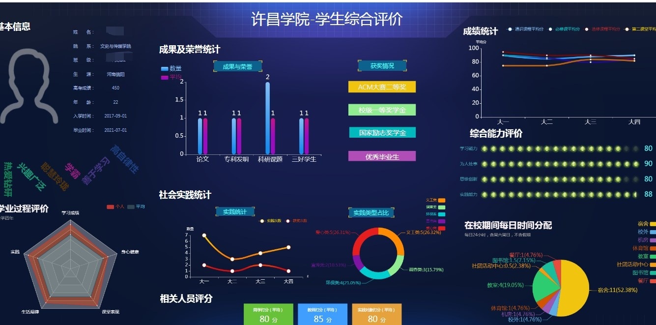 该项目通过收集分析学习成绩、第二课堂等数据等进行学生画像,并逐步应用于学生学业评价、预警、评优评先,追踪毕业生去向和专业课程等方面,为全面培养学生提供可视化帮助。
