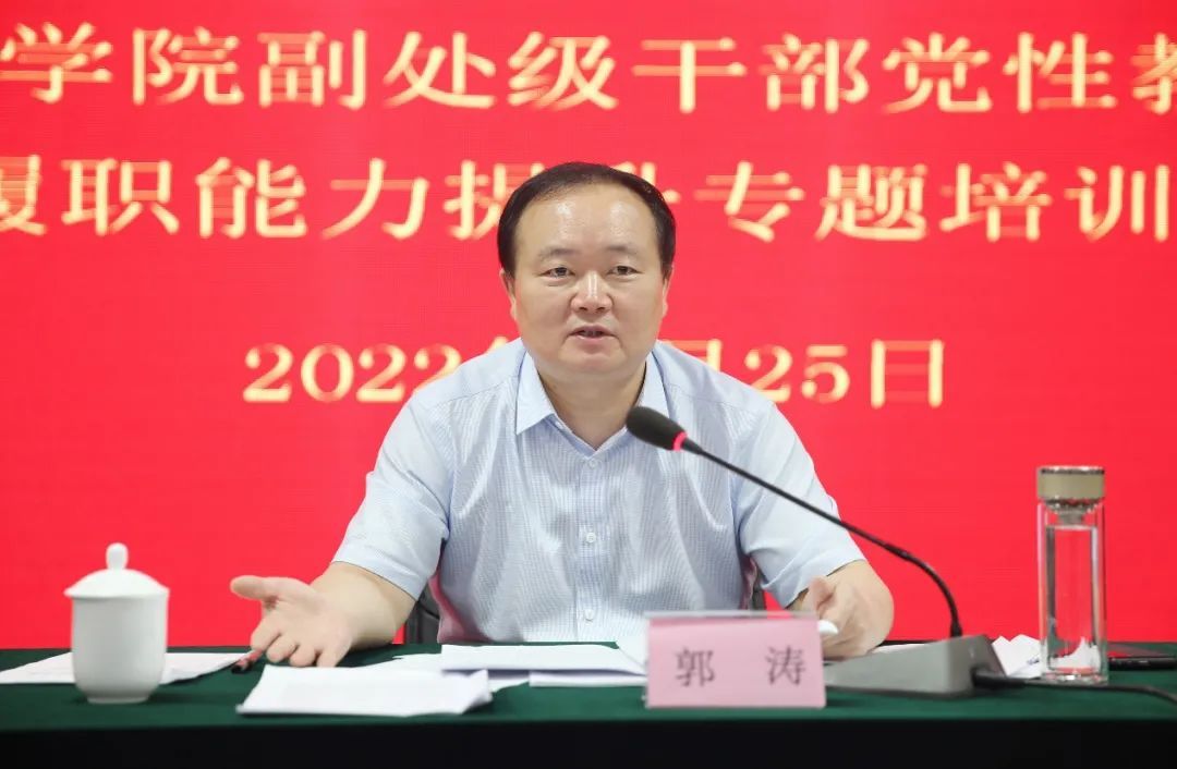 培训期间,郭涛作《认清形势 统一思想 提升能力 改进作风——奋力开创学校事业发展新局面》专题报告。郭涛在报告中深入分析了当前学校高水平应用型大学建设所处的关键阶段和面对的形势机遇,围绕聚焦“办学特色凝练”“办学层次提升”“办学空间拓展”三大攻坚任务,推动学校内涵式、高质量发展,中层副职干部履职应具备的基本要求和提升能力、转变作风,提振干事创业精气神等方面明确了目标任务,厘清了工作思路。
