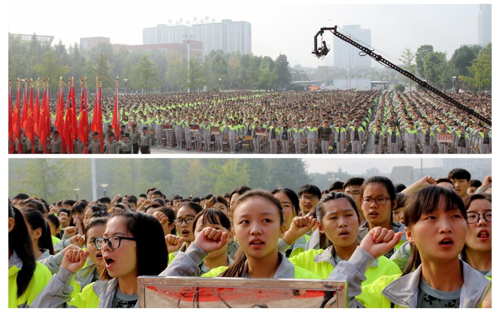 仪式上,校领导向新生军训连队授旗。2017级全体新生军训团员郑重宣誓:尊重教官,服从指挥,严格要求,刻苦训练;崇德砺志,博学敬业,立志成才,报效祖国。(图文 宁智沛 学生记者 王梦玲 黄鑫颖 航拍照片由耿利川老师提供)