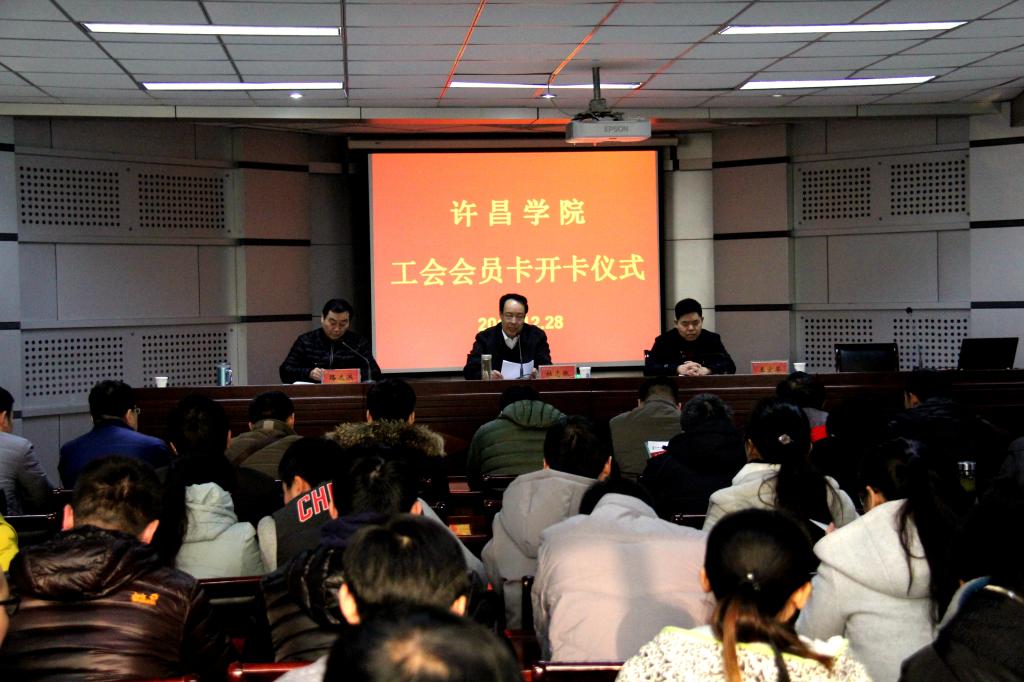 在2017年“双节”前夕,bet36体育在线的工会会员收到了学校送上的一份特殊礼物——河南省工会会员卡。12月28日下午,校工会在办公楼楼第三会议室举行bet36体育在线工会会员卡开卡仪式,校工会主席杜志傲、邮政储蓄银行许昌分行副行长王宏举出席仪式,bet36体育在线各分工会主席和会员代表140余人参加了开卡仪式,仪式由校工会副主席路运洪主持。