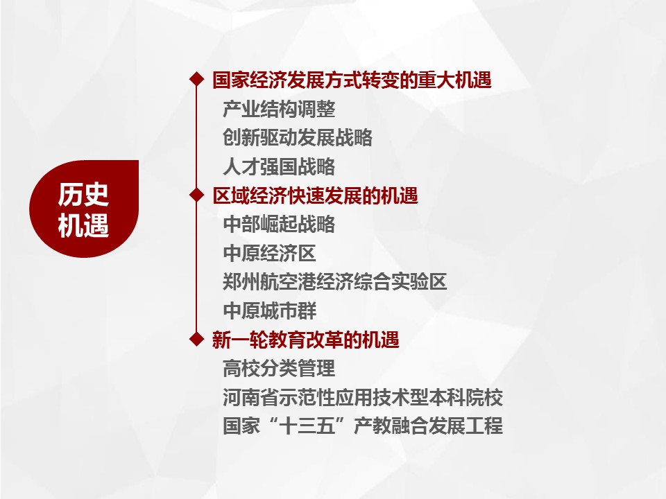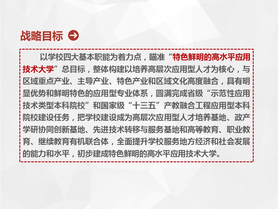 总规划明确提出今后五年的发展战略是“坚持四个统一、完善四项基本建设、实现四个突破、形成四大特色”,基本完成“三基一体”的建设任务,即五年内把学校建设成为高层次应用型人才培养基地、政产学研协同创新基地、先进技术转移与服务基地和高等教育、职业教育、继续教育有机联合体。实现发展战略的载体是“河南省示范性应用技术类型本科院校”建设和国家级“十三五”“产教融合发展工程应用型本科院校”建设。五年内事业发展的战略目标是初步建成以培养高层次应用型人才为核心,与区域重点产业、主导产业、特色产业和区域文化高度融合,特色鲜明的高水平应用技术大学。