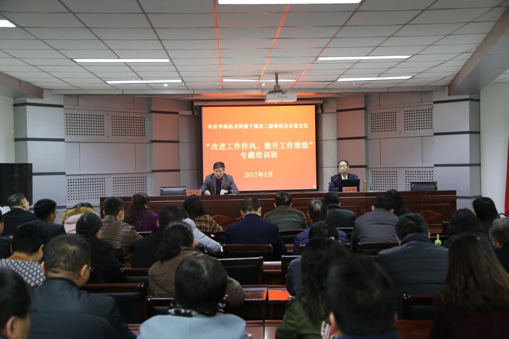 2月16日至17日上午,bet36体育在线在办公楼第三会议室举办了机关科级干部及二级单位办公室主任“改进工作作风、提升工作效能”专题培训班。党群机关、行政机关、创新创业学院、继续教育学院科级干部,二级学院办公室主任(副主任),后勤管理服务中心部分科级干部共计130余人参加了此次培训。党委副书记马超出席了开班讲座。