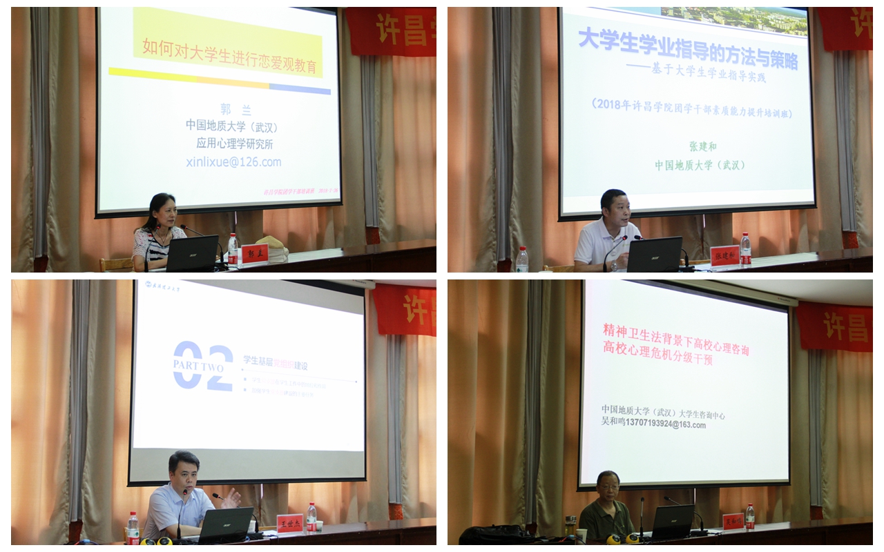 本次培训班根据《高等学校辅导员职业能力标准(暂行)》并结合bet36体育在线团学工作实际,邀请了中国地质大学(武汉)党委副书记王林清教授、中国地质大学(武汉)副校长傅安洲教授、中南财经政法大学党委副书记万清祥教授、中国地质大学党委常委、组织部部长储祖旺教授、中国地质大学原党委书记郝翔教授等10位湖北省知名思想政治工作专家为全体学员作了专题辅导报告。本次培训内容包括四个模块,一是辅导员角色认知与岗位特点,包括角色定位、角色价值与职业定向发展等;二是辅导员工作内容与方式方法,包括大学生党团组织建设与班级建设、恋爱观教育方法、大学生心理健康教育与危机识别处理、学业指导的方法和策略、大学生安全教育管理和突发事件处置、高校资助育人体系构建与实施等;三是辅导员工作对象及研究方法,包括当前大学生思想状况分析与调查方法、高校学生事务管理体系与方法创新等;四是辅导员工作环境解读,包括基于高等教育发展的我国学生工作变革、当前高校思想政治教育面临的挑战与对策。培训期间共开展了11场专题辅导报告。