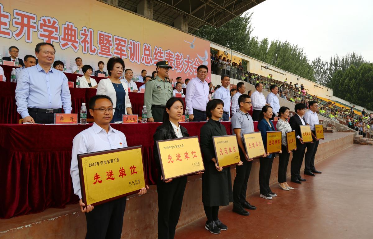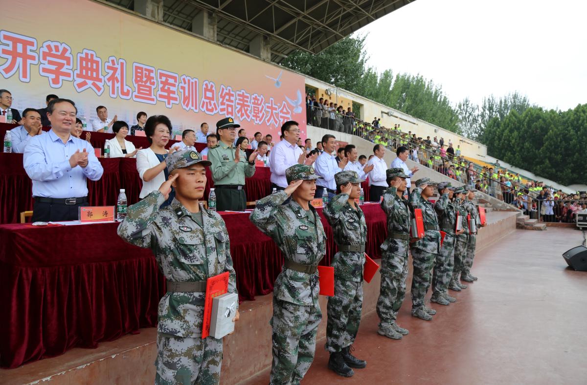 9月20日上午,bet36体育在线在羽飞田径场举行2019级新生开学典礼暨军训总结表彰大会。党委书记闫纪建,院长岳修峰,党委副书记孙海,纪委书记罗凤英,副院长崔斌、郭涛,工会主席高金星,许昌军分区党委常委、战备建设处处长陈福星出席大会并在主席台就坐。学校机关各部门和二级学院负责人、各团总支负责人、辅导员(班主任)和全体2019级新生共同参加军训会操和开学典礼。仪式由党政办公室主任潘春彩主持。