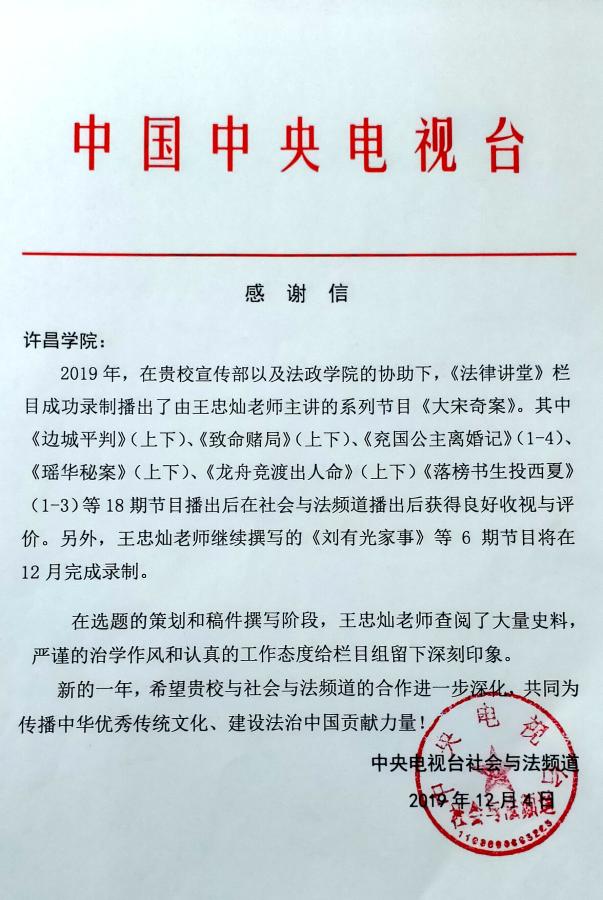 据了解,bet36体育在线曾在2017年就收到过来自中央电视台的感谢信。2016年11月至今,王忠灿老师在中央电视台“社会与法”频道播出主讲的《大宋奇案》系列节目已经播出40余集,为节目赢得了较高的收视率和观众满意度。