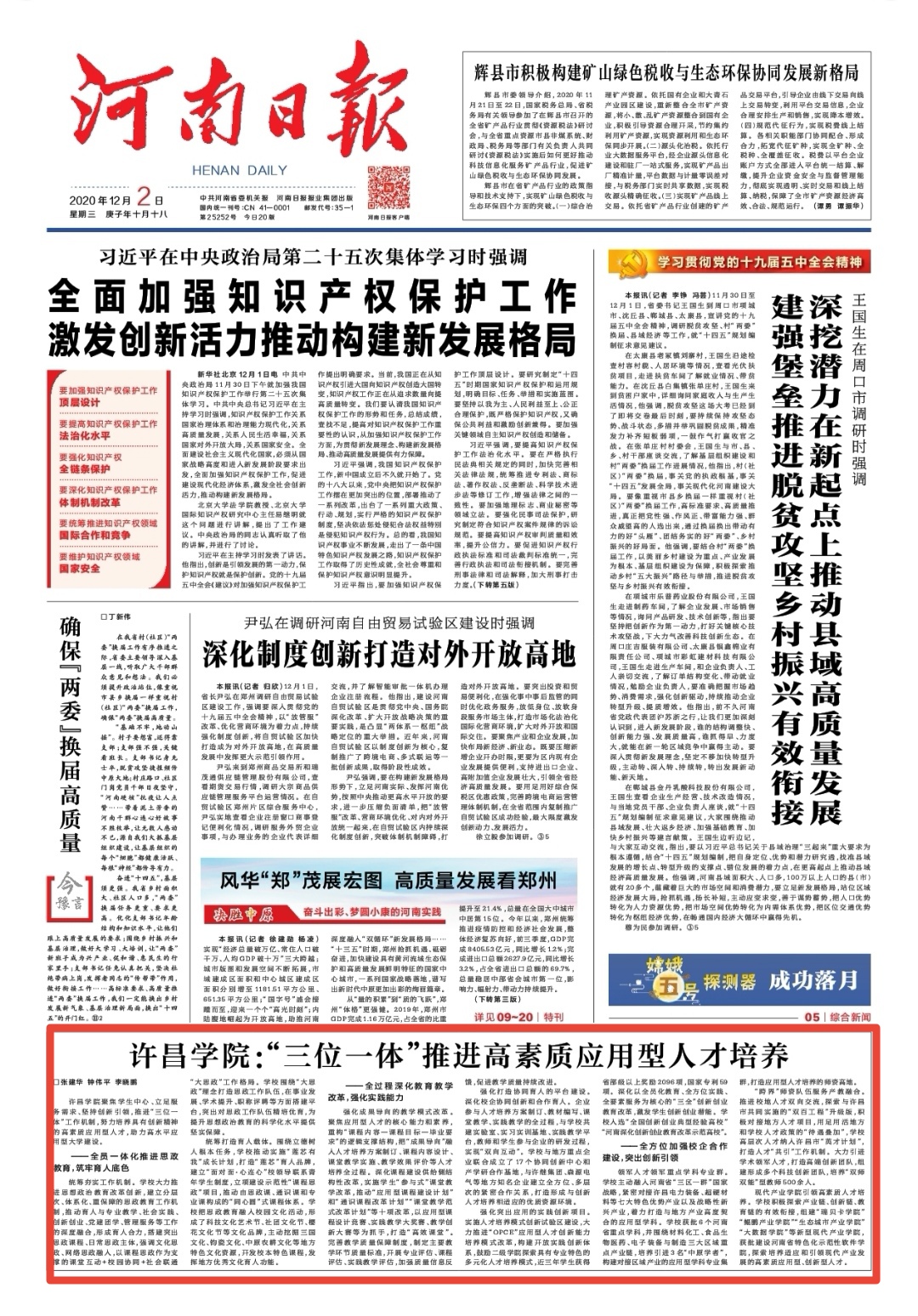 12月2日,《河南日报》头版以《bet36体育在线:“三位一体”推进高素质应用型人才培养》为题,从“全员一体化推进思政教育,筑牢育人底色”“全过程深化教育教学改革,强化实践能力”“全方位加强校企合作建设,突出创新引领”三个方面,详细报道了bet36体育在线聚焦学生中心、立足服务需求、坚持创新引领,推进“三位一体”工作机制,努力培养具有创新精神的高素质应用型人才,助力高水平应用型大学建设的具体举措和典型经验。